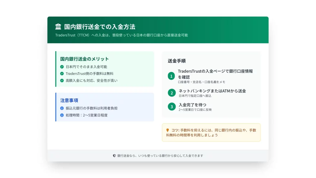国内銀行送金は、日本の銀行口座から直接TradersTrustの指定口座へ入金する方法です。