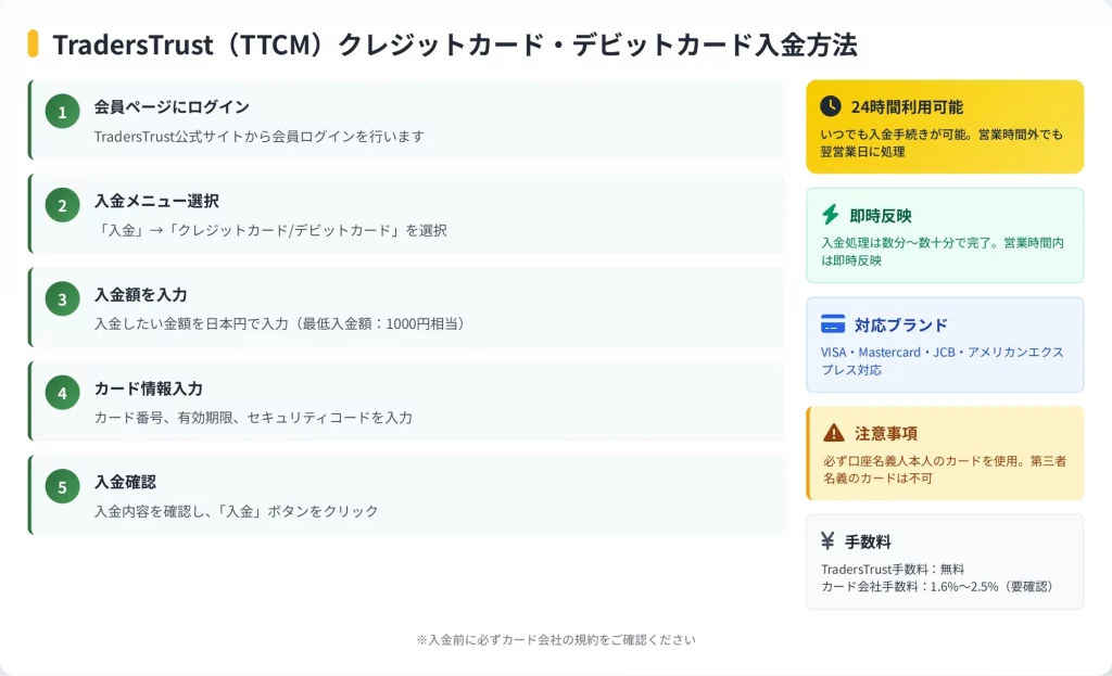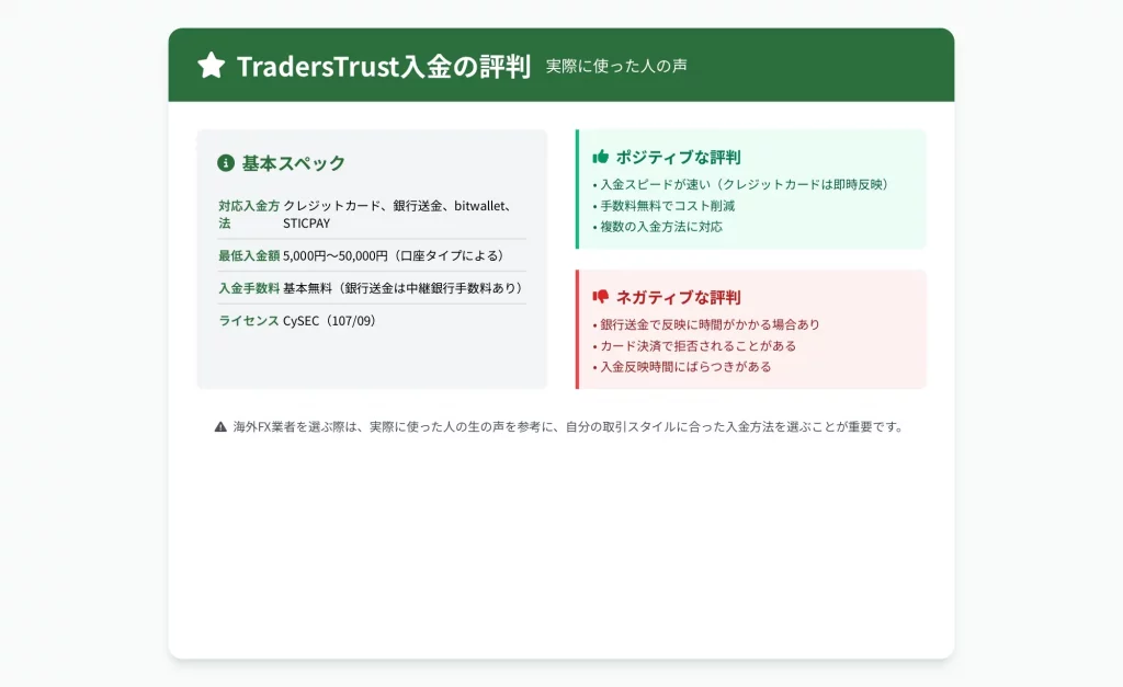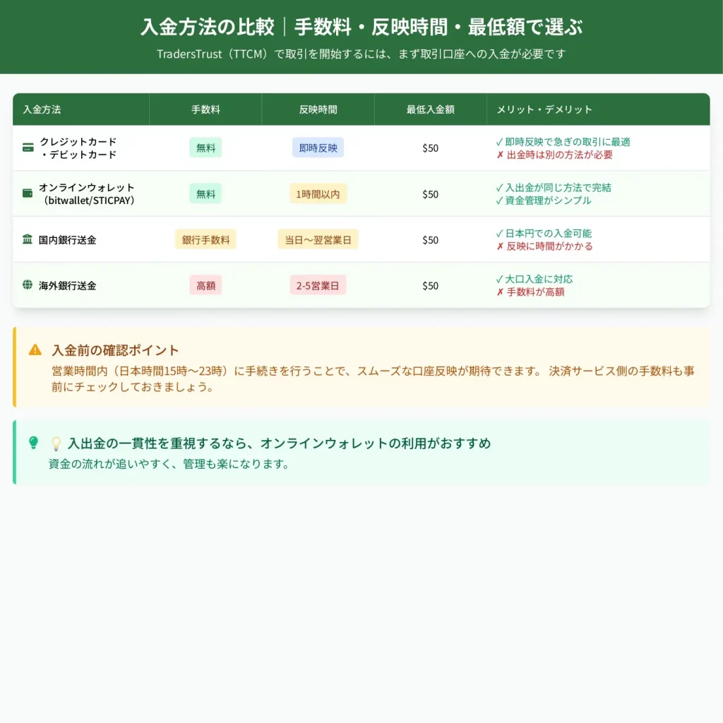 TradersTrustは複数の入金方法を提供しており、それぞれ手数料・反映時間・最低入金額が異なります。