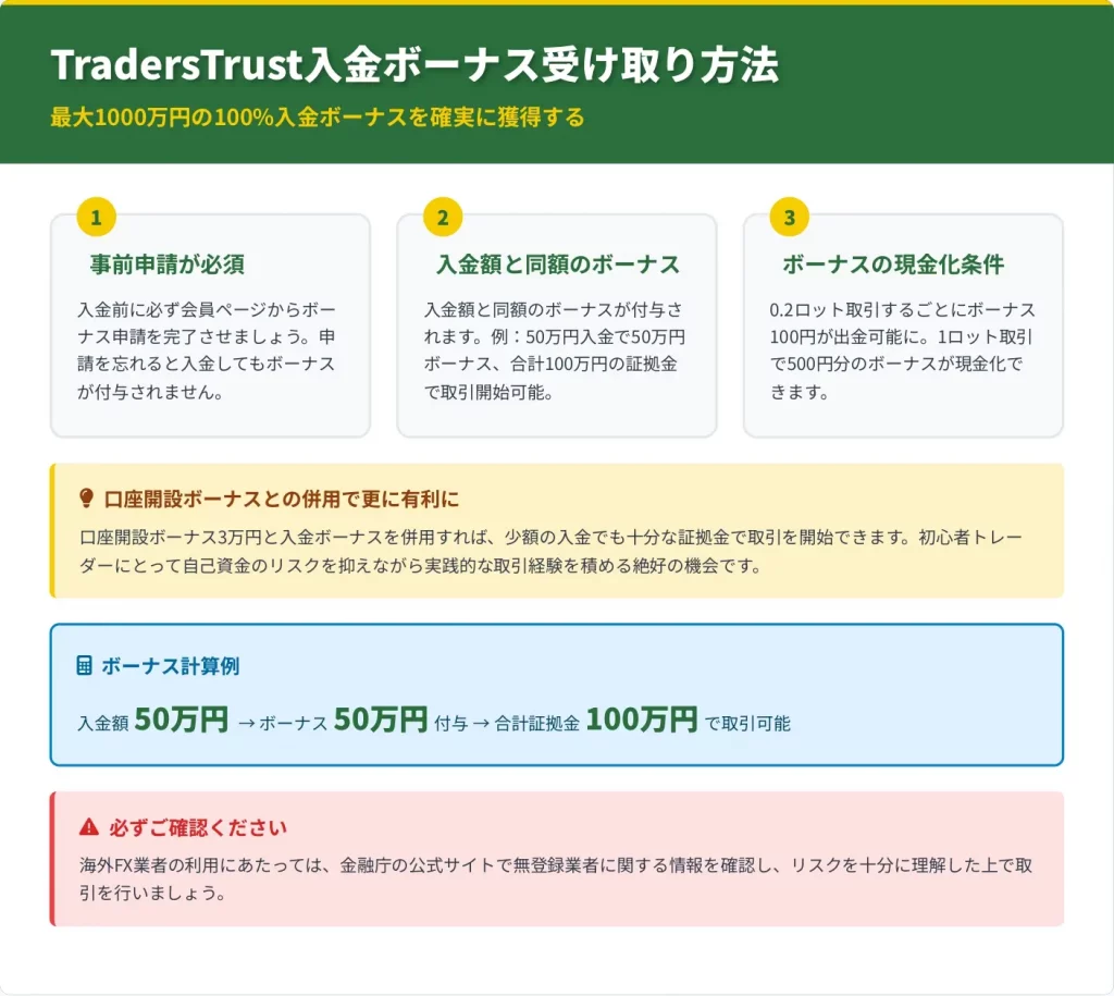 特にTradersTrustは2025年11月現在、期間限定で100%入金ボーナスを提供しているため、正しい手順を知らないと大きな機会損失につながります。