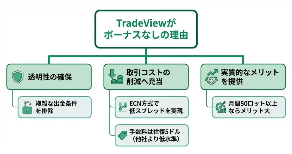 TradeViewはボーナスを一切提供せず、そのコストを低スプレッド・透明性・取引環境の整備に充当する戦略を採用している