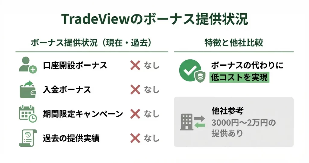 このセクションでは、TradeViewにおける各種ボーナスの提供状況と過去実績を明確に整理します。