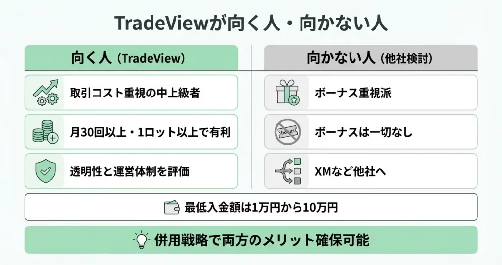 ここでは、TradeViewが向いているトレーダーの特徴と、逆に避けるべき理由、さらに他社との併用戦略まで整理し、最終的な判断材料を提供します。