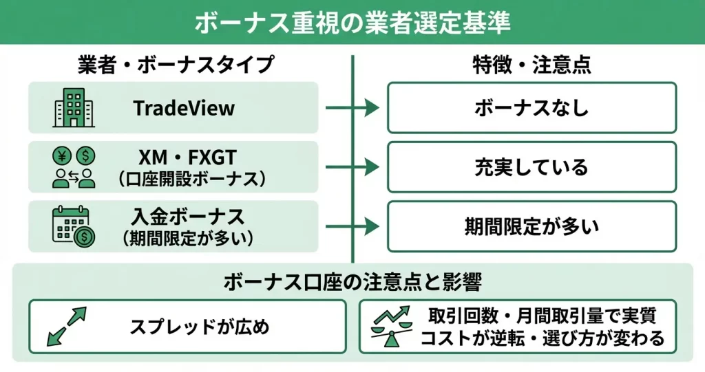 ボーナスの有無だけでなく、自分の取引スタイルに合ったコスト構造を選ぶことが重要です