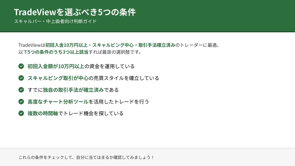 自分がTradeViewを選ぶべきか、以下のチェックリストで確認してください。