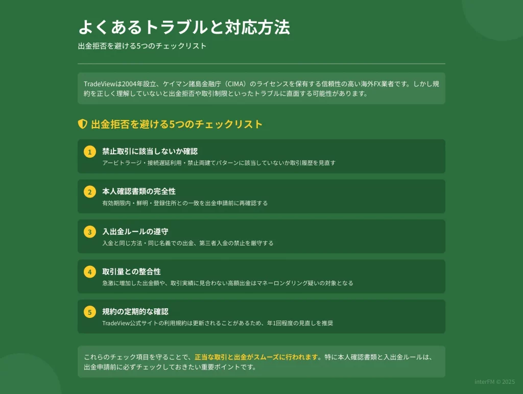 これは多くの海外FX業者に共通する状況であり、TradeView固有の問題ではありませんが、日本の法的保護の対象外である点は認識しておく必要があります。