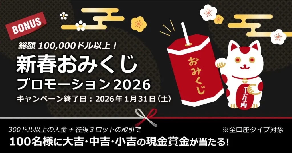 | 総額150,000ドル お年玉プロモーション2025 | 【2025年12月30日までの期間限定】 入金額・取引高の条件クリアで抽選で100名に現金で1,500ドルプレゼント |