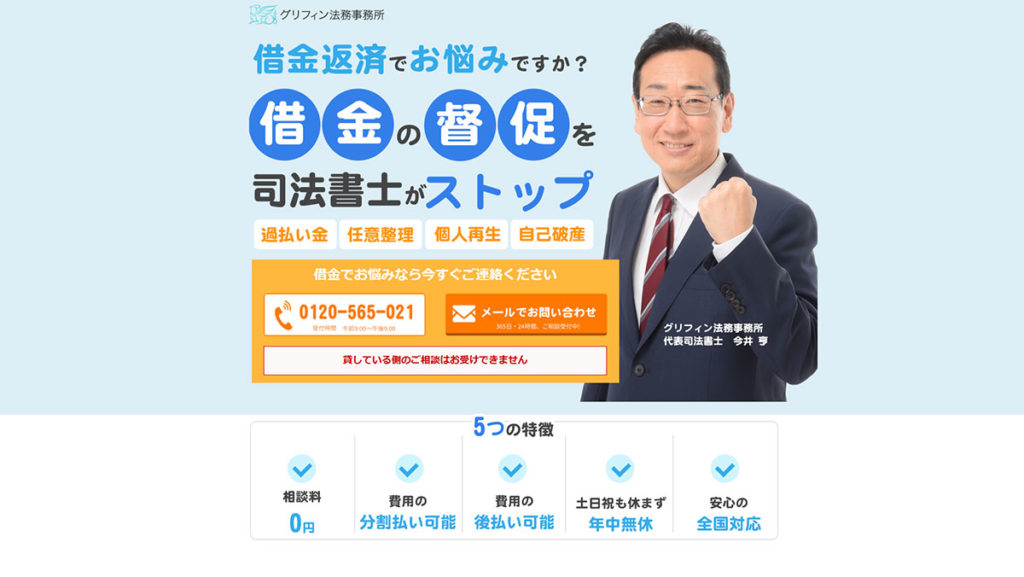 相談費用は無料で、解決費用は1社あたり50,000円からとなっており、分割払いにも対応しているため、経済的な負担を軽減しながら依頼することが可能です。平日は9:00から21:00、日曜は10:00から18:00まで電話相談を受け付けており、全国からの相談にも対応しています。