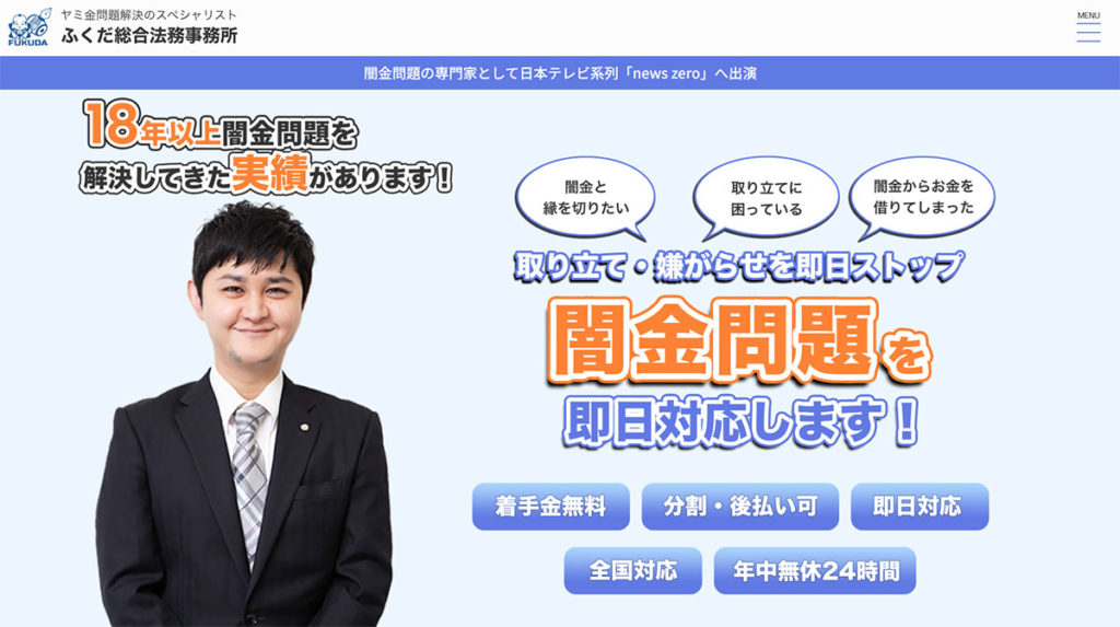 ふくだ総合法務事務所所は、闇金との関わりから発展した口座凍結トラブルの相談を多数扱ってきました。闇金との対応も、18年の実績がある代表自らが対応。親身な対応が特徴で、口座凍結の事情を細かくヒアリングし、必要に応じて銀行や警察への説明書類作成をサポートしてくれます。