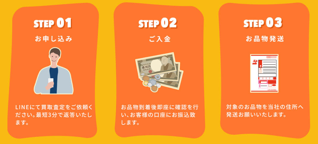 公式サイトからLINEで買取査定を依頼し、名前・連絡先・振込先口座などを入力します。最短3分で返信がきます。