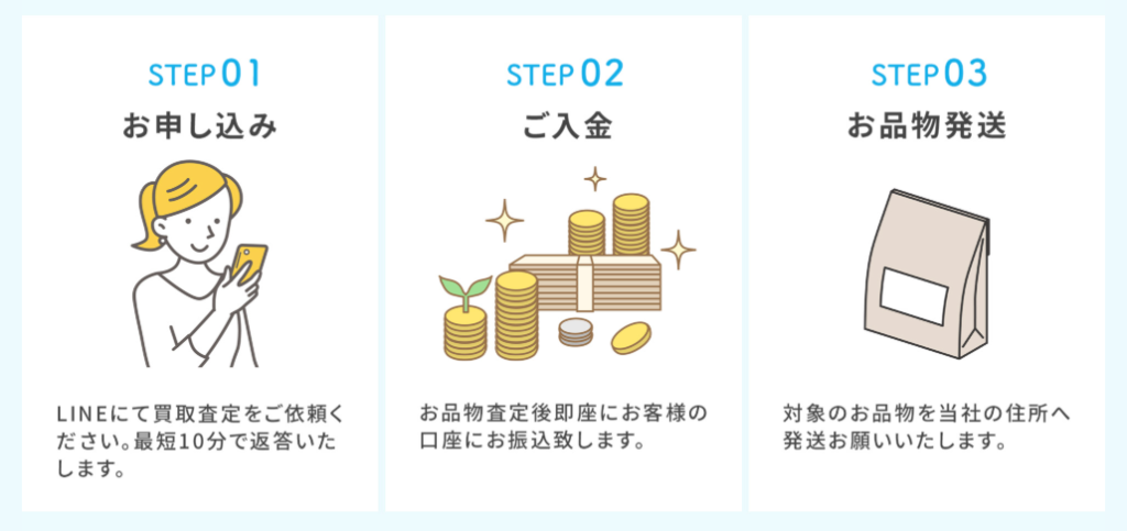 この「先に商品購入→後から買取金振込」という流れが、いわゆる「先払い買取」と呼ばれる手法です。