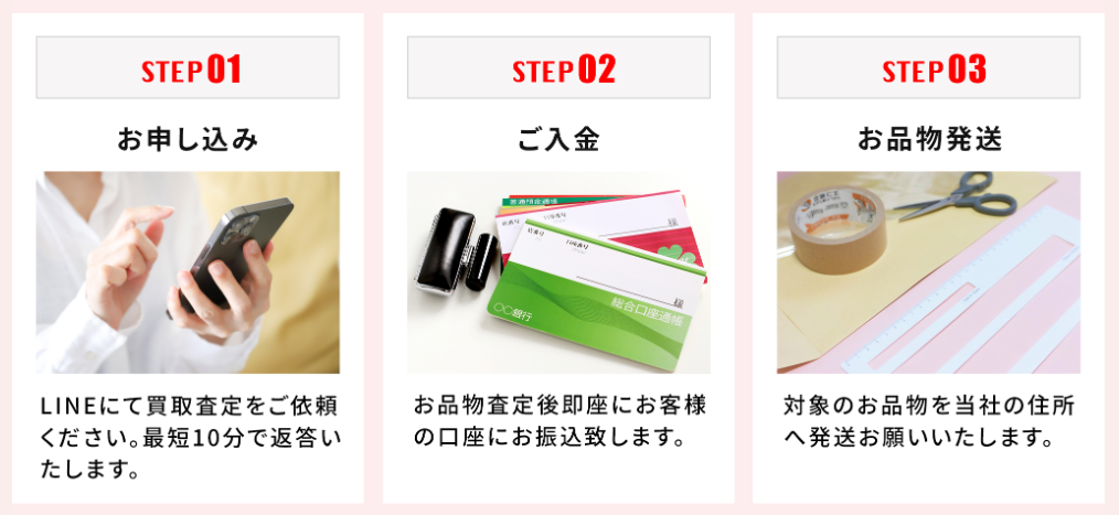 買い取ってほしい商品の写真を送り、査定を依頼します。査定結果に納得できたら契約を結びます。