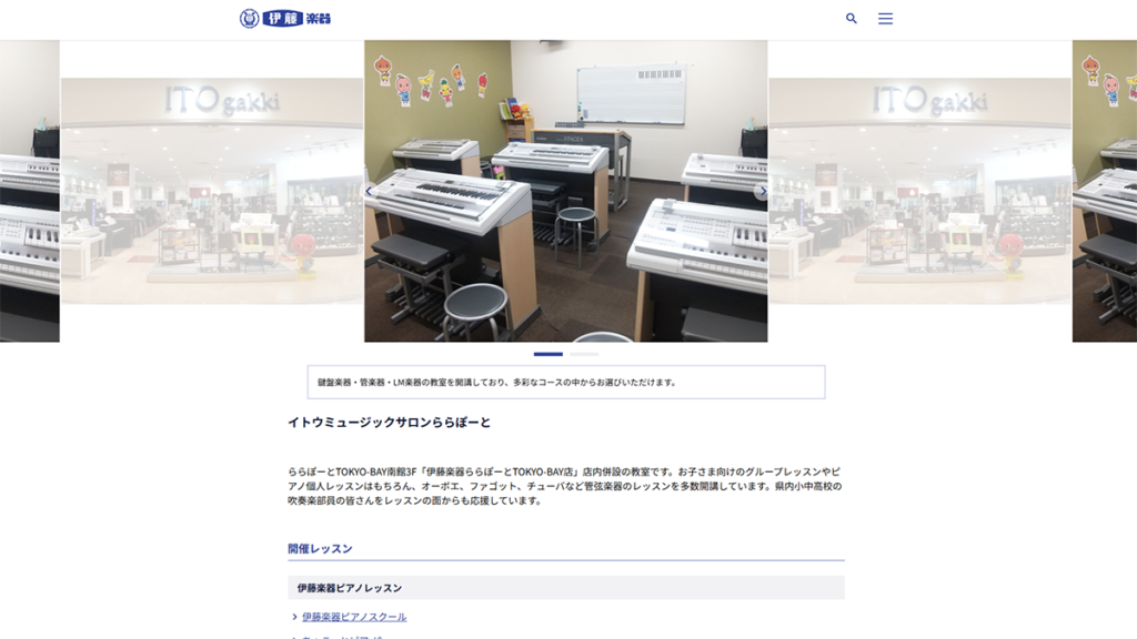 伊藤楽器 ミュージックサロンららぽーとは、南船橋の大規模商業施設「ららぽーとTOKYO-BAY」南館3Fにある音楽教室です。船橋市内でもアクセスが良く、JR京葉線・南船橋駅から徒歩約10分ほどで通えるため、買い物やお出かけのついでに立ち寄りやすい立地が魅力です。教室では、ピアノの個人レッスンをはじめ、管楽器や弦楽器、ヤマハ音楽教室コースなど多彩な音楽レッスンが開講されており、子どもから大人まで幅広い世代が通っています 。