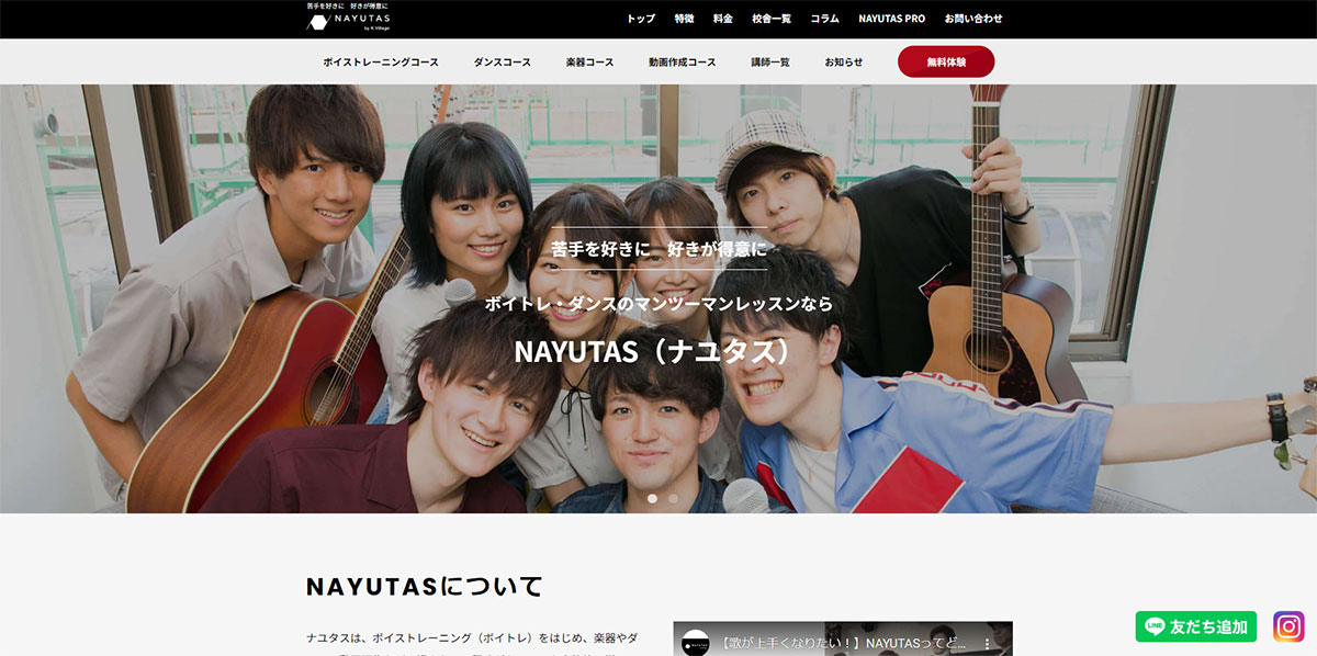 マンツーマンレッスンで、ナユタス独自のメソッドと定期的なカウンセリングで、自分の目標に沿ってレッスンができ、早い成長を感じることができます。「苦手を好き 好きを得意」に変えられるシステムで、楽しく通うえるボーカル教室です。