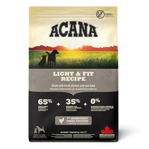 アカナ ライト&フィットは、肥満気味の全犬種を対象に、脂質と炭水化物を控えめに設計。カナダ産の新鮮な鶏肉や生のヘイクなどの高品質な動物原材料を65%、フルーツや野菜、ハーブを35%とバランスよく配合し、愛犬の健康的な体重管理をサポートしながら、充分な満足感を与えるドッグフードです。