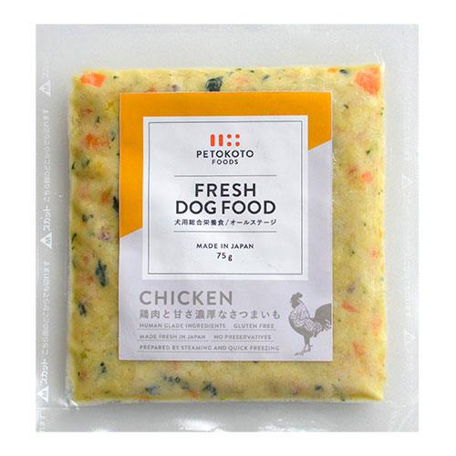 | 原材料 | 【チキン】鶏肉、さつまいも、にんじん、卵、小松菜、すりごま、亜麻仁オイル、フィッシュオイル、ミネラル類(カルシウム、リン、ナトリウム、マグネシウム、カリウム、鉄 、亜鉛、銅、ヨウ素、セレン)、ビタミン類(A、B1、B2、B12、D、E、コリン) |