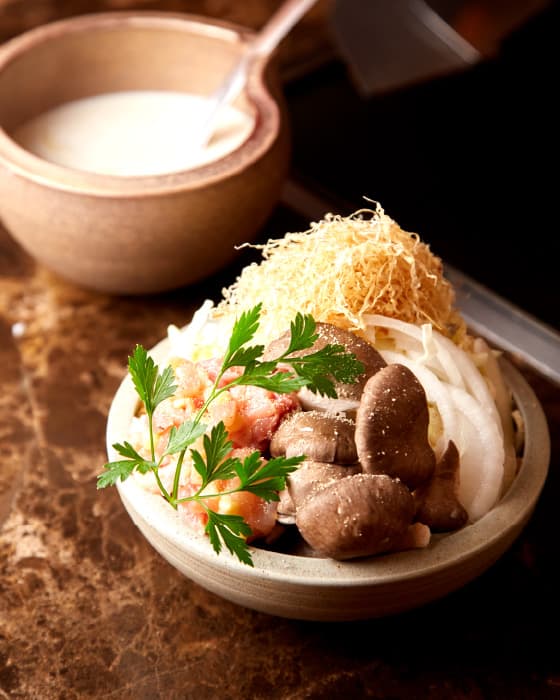 歯応え抜群の伊達鷄に霜降りひらたけを合わせたクリームもんじゃ。イタリアンパセリとレモンの香りがアクセント。