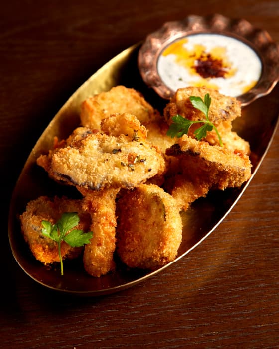 2種のきのことズッキーニを芳ばしくフリット。爽やかなザジギディップと一緒にお楽しみ下さい。