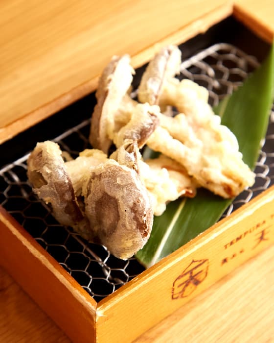 肉厚な霜降りひらたけを丸ごと天ぷらにした逸品。サクサクでジューシーなこの季節だけの味わいを贅沢にどうぞ。