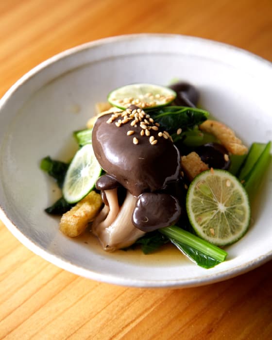 霜降りひらたけの味と香りをしみ込ませた鰹出汁に、小松菜を加えました。香ばしい油揚げと爽やかなすだちがアクセント。