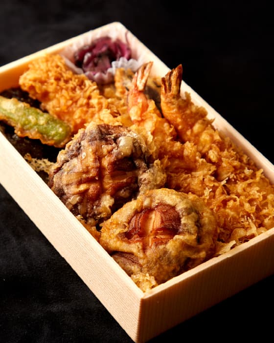 一番採り生どんこを丸ごと2つ使用した贅沢な天丼。外はサクサク中はモチモチ、高い香りが食欲をそそる一品です。