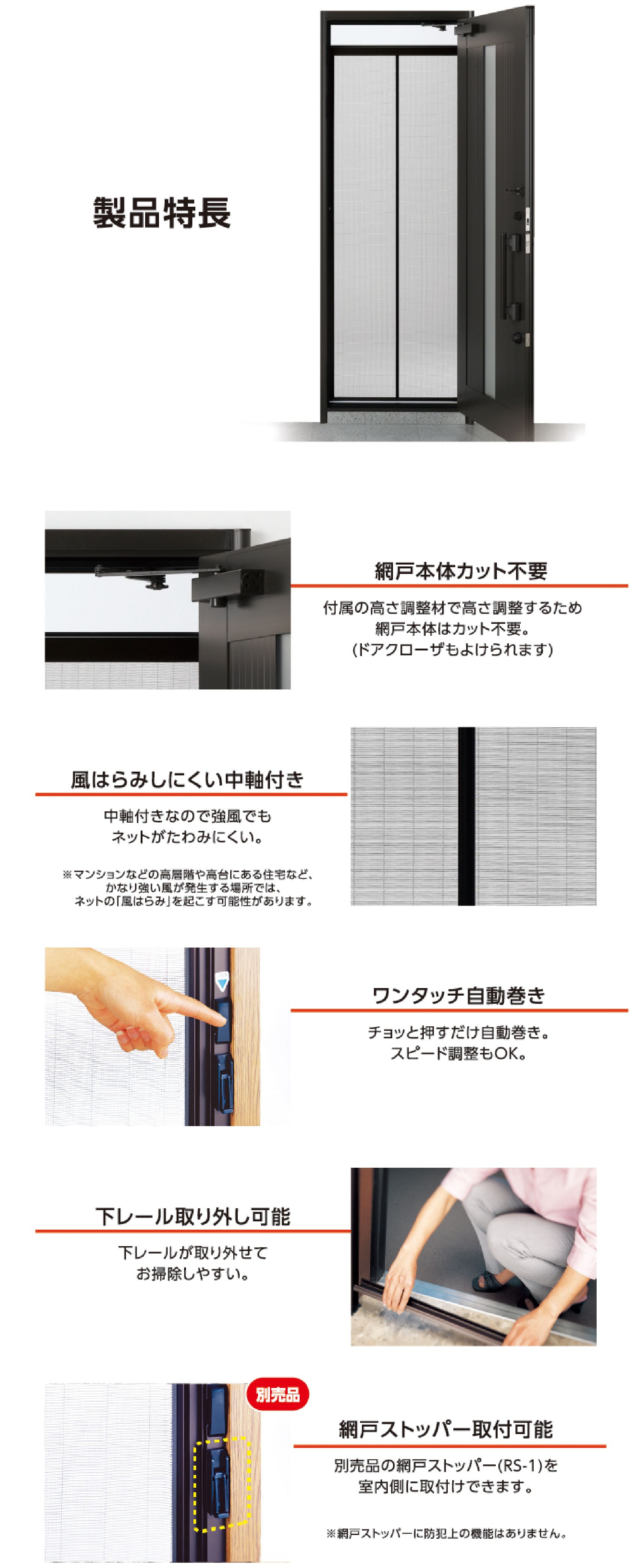 オールアルミ製のロール網戸。ワンタッチで網を自動で巻き取って収納します。高さ調整材がついているため、網のカットをせずに高さが調整できます。既製サイズなので、部品のカットは必要ですが、その分リーズナブルな価格でお買い求めいただけます。