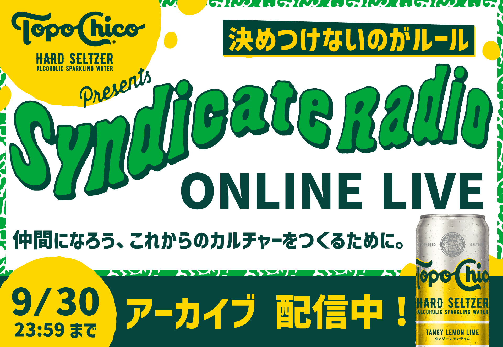 “決めつけないのがルール”を合言葉に、新しい企てをする仲間が集うラジオ番組「シンジケートラジオ」が、トポチコハードセルツァー、インターFMに加えて、BE AT TOKYOともタッグを組みオンラインライブを開催。さまざまな出演者のパフォーマンスを通じて、自由な価値観やカルチャーを共有するひとときをお届けします。