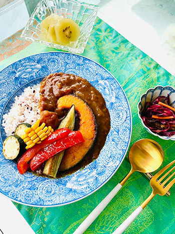 暑い夏にも食が進むトマトカレーに、野菜が取れるよう夏野菜の素揚げをどっさり乗せているそう。そしてご飯は雑穀米。付け合わせにマリネ、さらにはデザートまで…どれも美味しそうです。