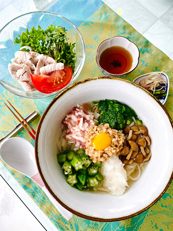 こちらも暑い夏にもツルッと食べられる稲庭うどんに、ネバネバ食材オクラ、なめこ、モロヘイヤ、長芋の梅和え、大根おろし、納豆、卵を乗せているそう。冷しゃぶサラダも食が進みそうですね。