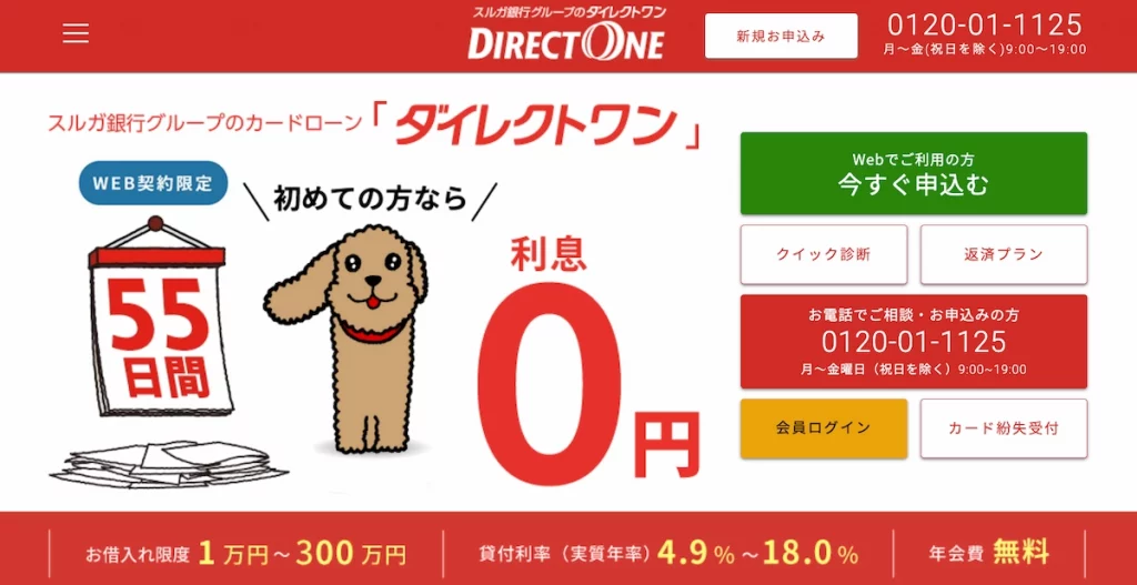 ダイレクトワンは初回キャンペーンが充実しており、55日間利息ゼロ円で利用できます。