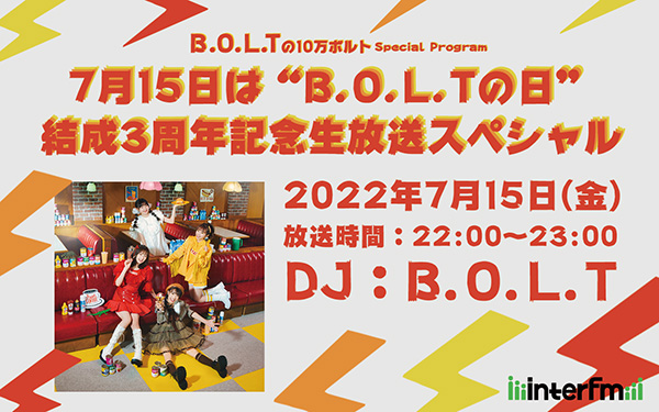 今回、来月7月15日に結成3周年を迎えるB.O.L.Tが、7月15日は“B.O.L.Tの日”として、当日18時から都内でツアーFINALと共に、3周年記念ライブを予定しており、ライブ終了後にメンバー(内藤、高井)がinterfmに駆け付け、22時から1時間の記念特番を生放送します。