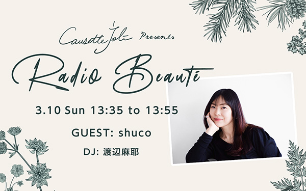 毎月第二日曜13:35頃~お送りしている「Causette.Joli presents Radio Beauté」は、"指先から花、咲う"日本製ネイルブランドCausette.Joliとともに、いまを輝く人たちをゲストに迎え、自分流のライフスタイルについて考えるスペシャルコーナー。