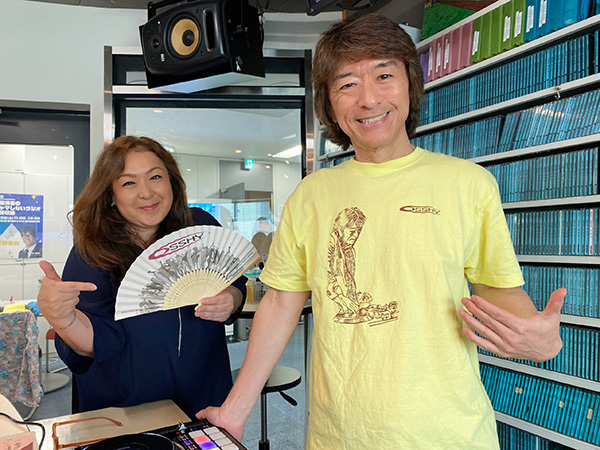 SAYOKO「私もOsshyさんも5曲ずつ選んでいます。そして、私が持っている扇子、Osshyさんが着ているTシャツは、Osshy Goods 2023年NEW バージョン」