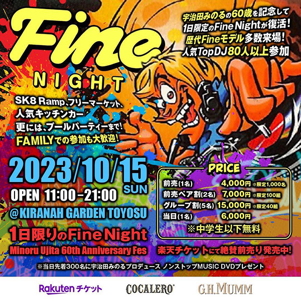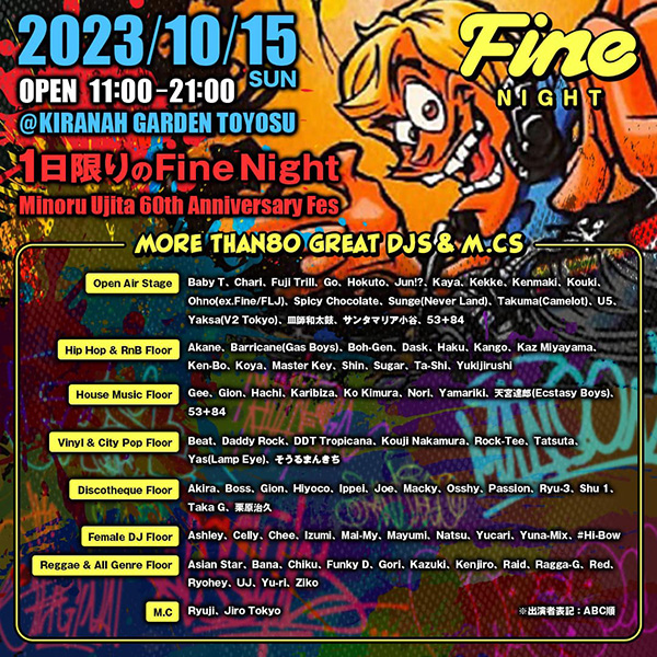 宇治田「60歳になったのをきっかけに、コロナ禍もあり、DJも仕事を失って本当に苦労した。僕もそうだったし。もう一度、みんなで集まって日本のクラブ・ディスコシーンを盛り上げていきたいな。と思ったんです。僕って"Fine Night"をやっていたので、 "Hip-Hop、Disco、House、Trance、Reggae、様々なジャンルのDJと付き合いがあるので、1つのジャンルに拘りません。この10/15は、心あるDJと心あるアーティストが集まるので、地球上で一番HAPPYなPartyになると思います」