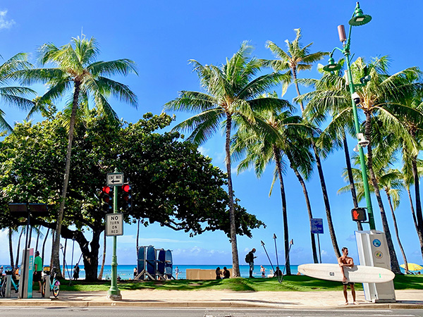 ワイキキビーチにはサーファーや海水浴を楽しむ人が集まっています。