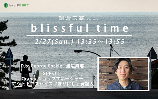 13時台後半の「鎌倉天幕 presents blissful time」には、アウトドアセレクトショップOrangeのショップマネージャーで、アウトドアスパイス「ほりにし」の発起人、堀西晃弘さんをお迎えして、スパイス誕生の裏話や、ショップマネージャーならではの休日の過ごし方など、色々伺ってみたいと思います!