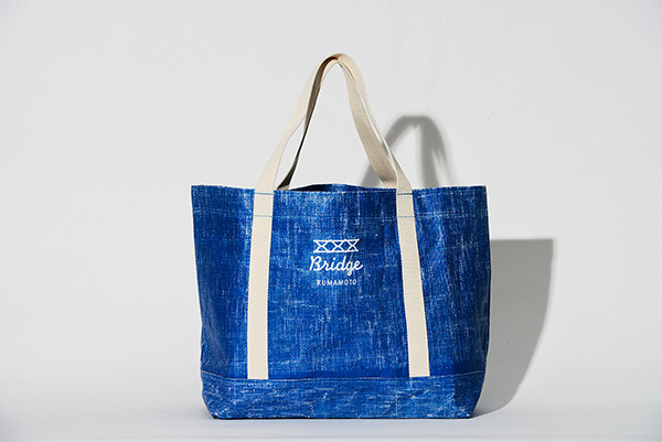 BRIDGE KUMAMOTOは、クリエイティブの力で災害復興を考える団体で、被災地域などで使用された廃棄予定のブルーシートをリメイクして作った「ブルーシード(復興のたね)バッグ」や、熊本城の瓦のかけらが入った「熊本城瓦御守」などを手掛け、その売上の一部を復興支援に役立てています。
