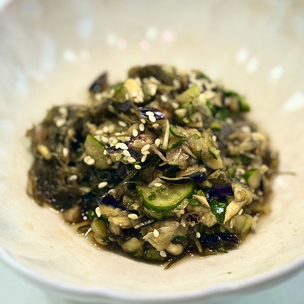 3.きゅうり、みょうが、しょうがを一緒にいれ同様に刻み、なすと合わせる。