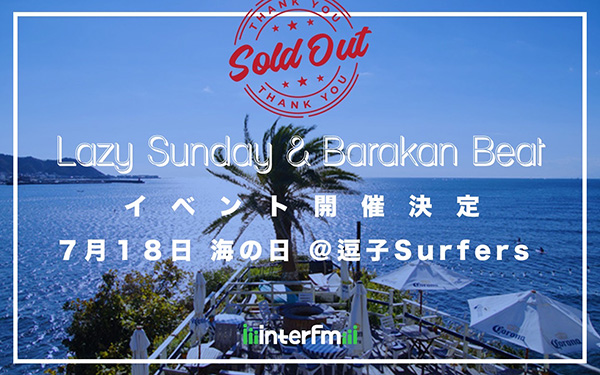 interfmで日曜日放送『Lazy Sunday』DJのGeorge Cockleと渡辺麻耶、『Barakan Beat』DJのPeter Barakan出演の公開生放送イヴェントを7月18日(月)海の日、逗子 Surfersで開催します。