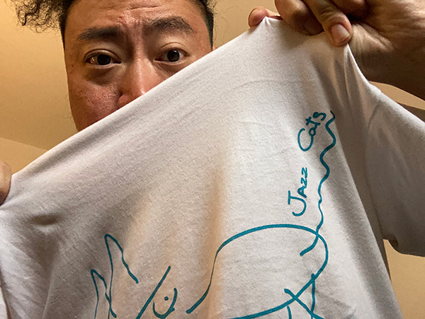 写真は、手売りしたという「Jazz Cats Tシャツ」(かわいいですね)