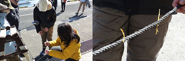 そこで、海野さんと藤井さんが、ワカメの種付けを体験。