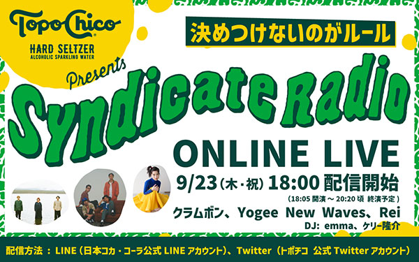 9月23日(木・祝)に開催する「Topo Chico Hard Seltzer Presents “Syndicate Radio ONLINE LIVE”」は、普段番組をお届けしているInterFMのラジオブースを飛び出し、MCのemmaさんと豪華ゲストが勢揃いした一夜限りの特別生配信イベントです。ゲストには、若者からも絶大な人気を誇るアーティスト「クラムボン」や「Yogee New Waves」、「Rei」を迎え、「決めつけないのがルール」をテーマにしたトークやライブ演奏をお楽しみいただけます。