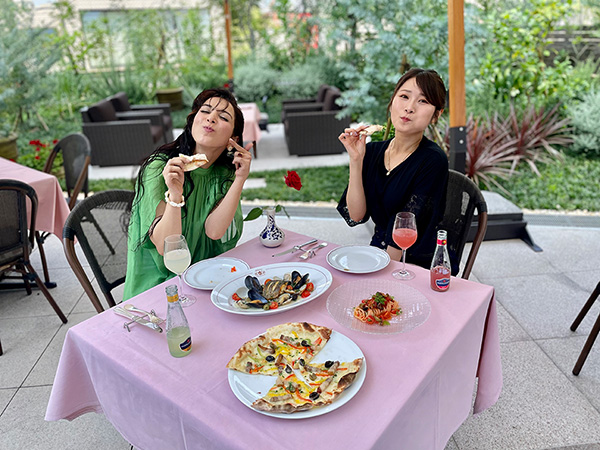 Omosan STREET内「Ao × Omotesando Just New!」のアンバサダー・サヘル ローズさんとサヘルさんのマネージャー橋さんが、2F「La Terrazza SABATINI Omotesando」で、ご機嫌なオフタイムを過ごしました。
