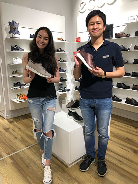 まずはシューズブランド「ECCO」から、小島さん。新しいアイテム「FLEXUR RUNNER」をご紹介いただきました。見た目はレザーで品があるデザインなのに、とっても歩きやすい!長く愛用していただけるシューズですよね。