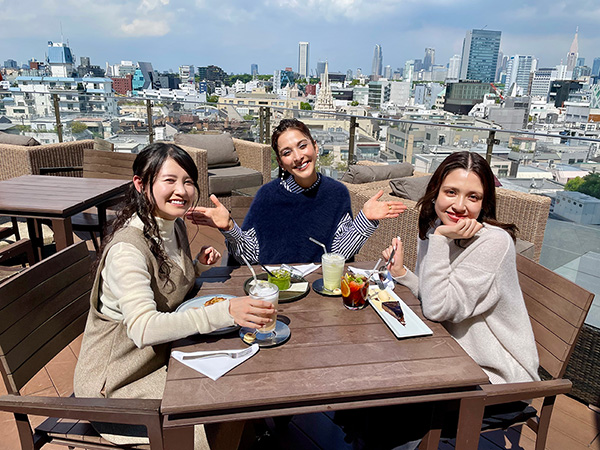 Omosan STREET内「Ao x Omotesando Just New!」のアンバサダー、サヘル ローズさん&新井サブリナさん&諸岡沙紀さんが5F「TWO ROOMS」で秋の女子会♪