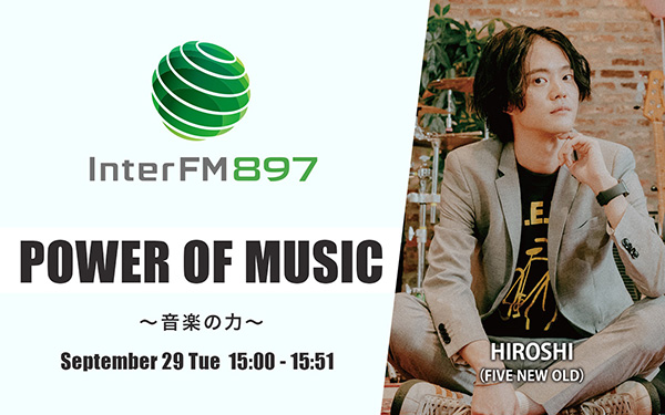 9/29(火)15:00からは、FIVE NEW OLDのボーカル&ギター、HIROSHIが選曲を担当。