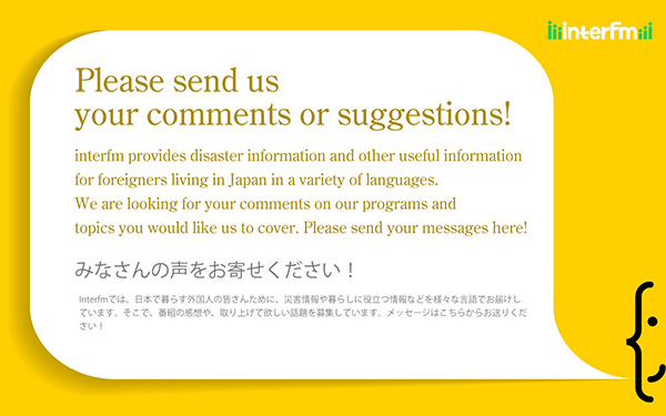 Por favor, envie seus comentários e preferências sobre os tópicos que deseja abordar no programa para voice@interfm.co.jp.
