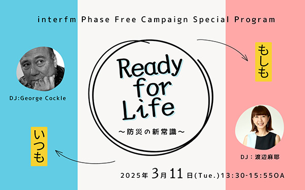 3月11日(火)午後1:30から、Lazy Sundayでお馴染み George Cockleと渡辺麻耶が、interfm Phase Free Campaign Special Program 『Ready for Life ~防災の新常識~』を生放送でお届けします。
