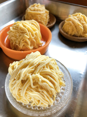 ・あら熱が取れたらホイップクリーム用の50グラムを取り出して残りの250グラムを潰す。裏ごしをして栗の粉を作る