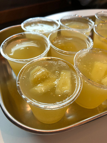 ・常温のパイナップルジュースを混ぜて容器に入れ、フルーツを入れて冷蔵庫で冷やす。完成!