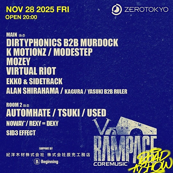 VIRTUAL RIOT、DIRTYPHONICS、K MOTIONZらが出演する『Rampage Roadshow Tokyo』が11月28日(金)、新宿 ZEROTOKYO にて開催!